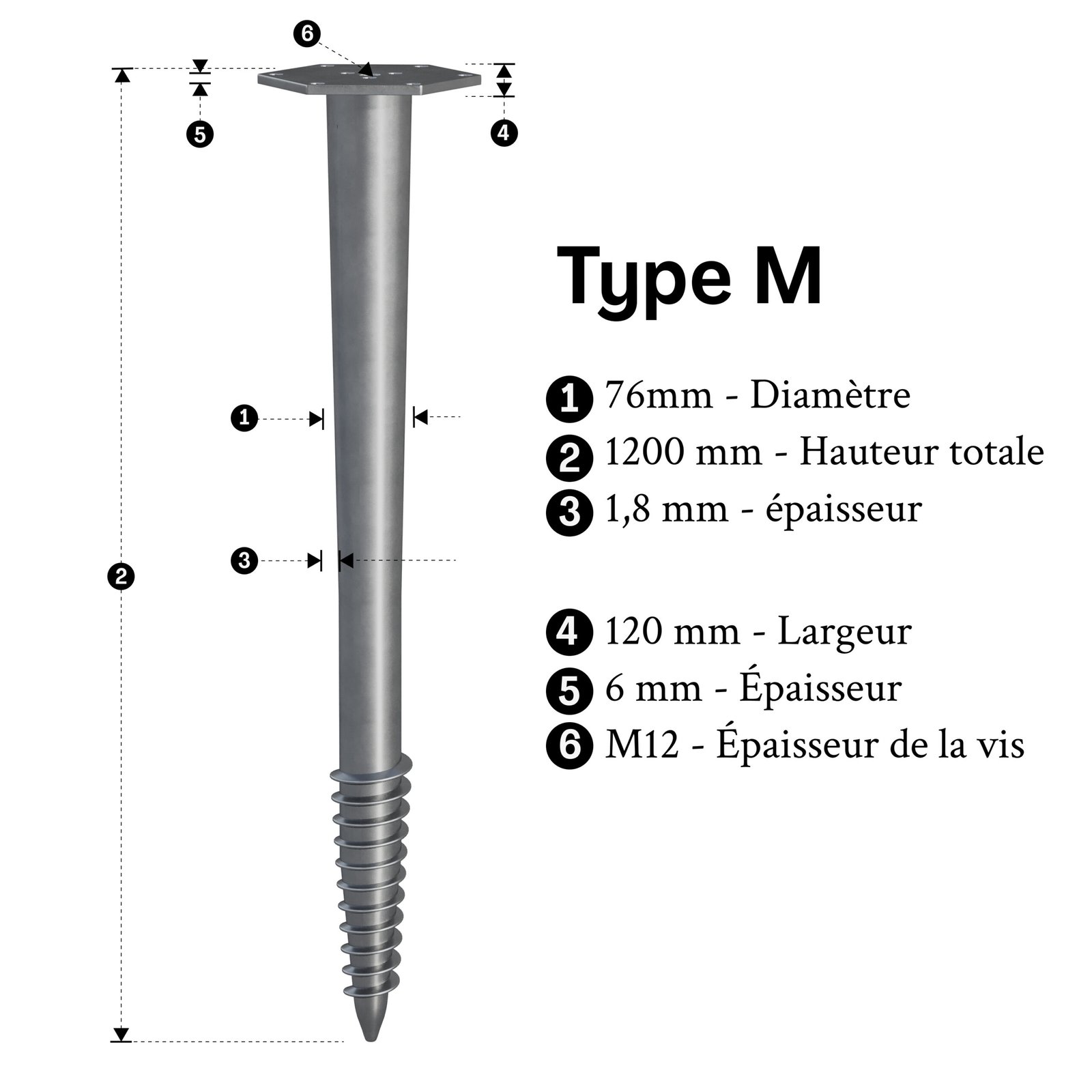 La plaque à pieux vissés de type M est conçue pour soutenir le cadre monté. Si les pieux vissés ne sont pas installés en ligne parfaitement droite, ce n’est pas un problème : la plaque est large et le cadre n’a pas besoin de reposer exactement au centre. La plaque comprend également un espace pour une tige filetée et des trous supplémentaires au cas où le cadre ne s’alignerait pas avec le centre.