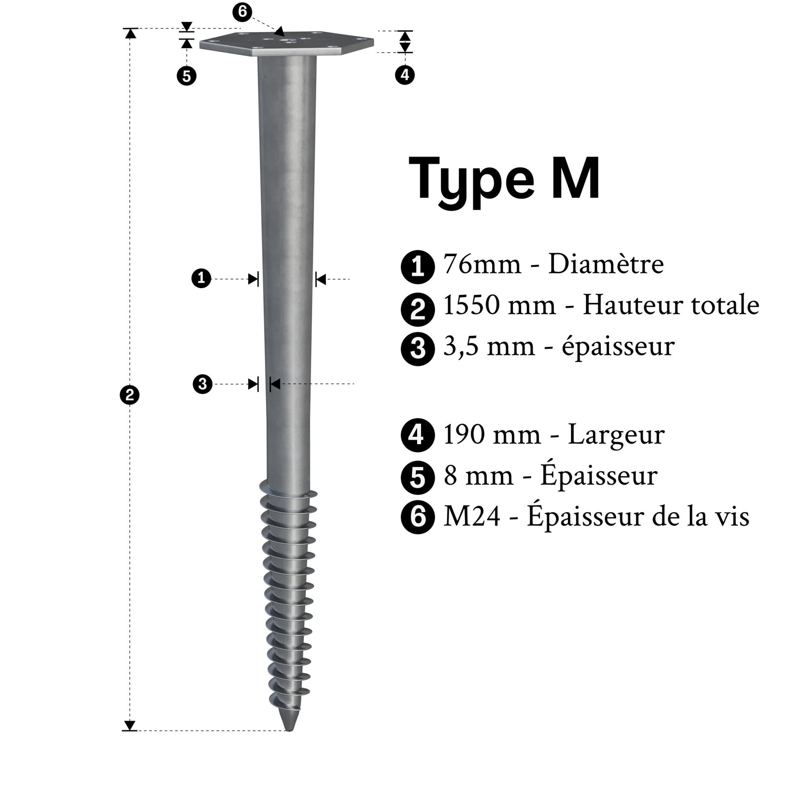 La plaque à pieux vissés de type M est conçue pour soutenir le cadre monté. Si les pieux vissés ne sont pas installés en ligne parfaitement droite, ce n’est pas un problème : la plaque est large et le cadre n’a pas besoin de reposer exactement au centre. La plaque comprend également un espace pour installer une tige filetée et des trous supplémentaires au cas où le cadre ne s’alignerait pas avec le centre.